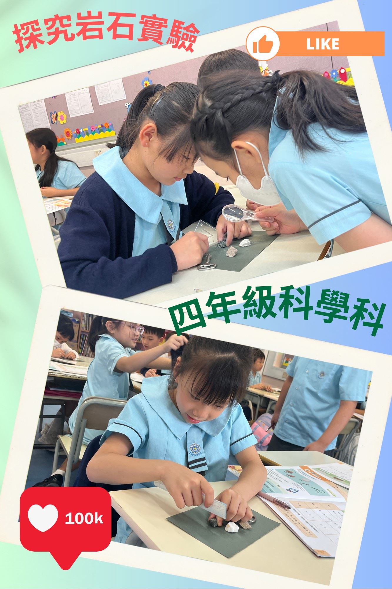 四年級科學科小慈和小天在學甚麼﹖本校的科學科強調「動手動腦」的重要性,培養學生科學探究和解決問題的能力,更著重培養學生對科學的好奇心和學習興趣。這次小慈和小天透過動手實驗,觀察不同岩石的硬度、顏色和顆粒的異同,從而培養學生從做中學習的態度。