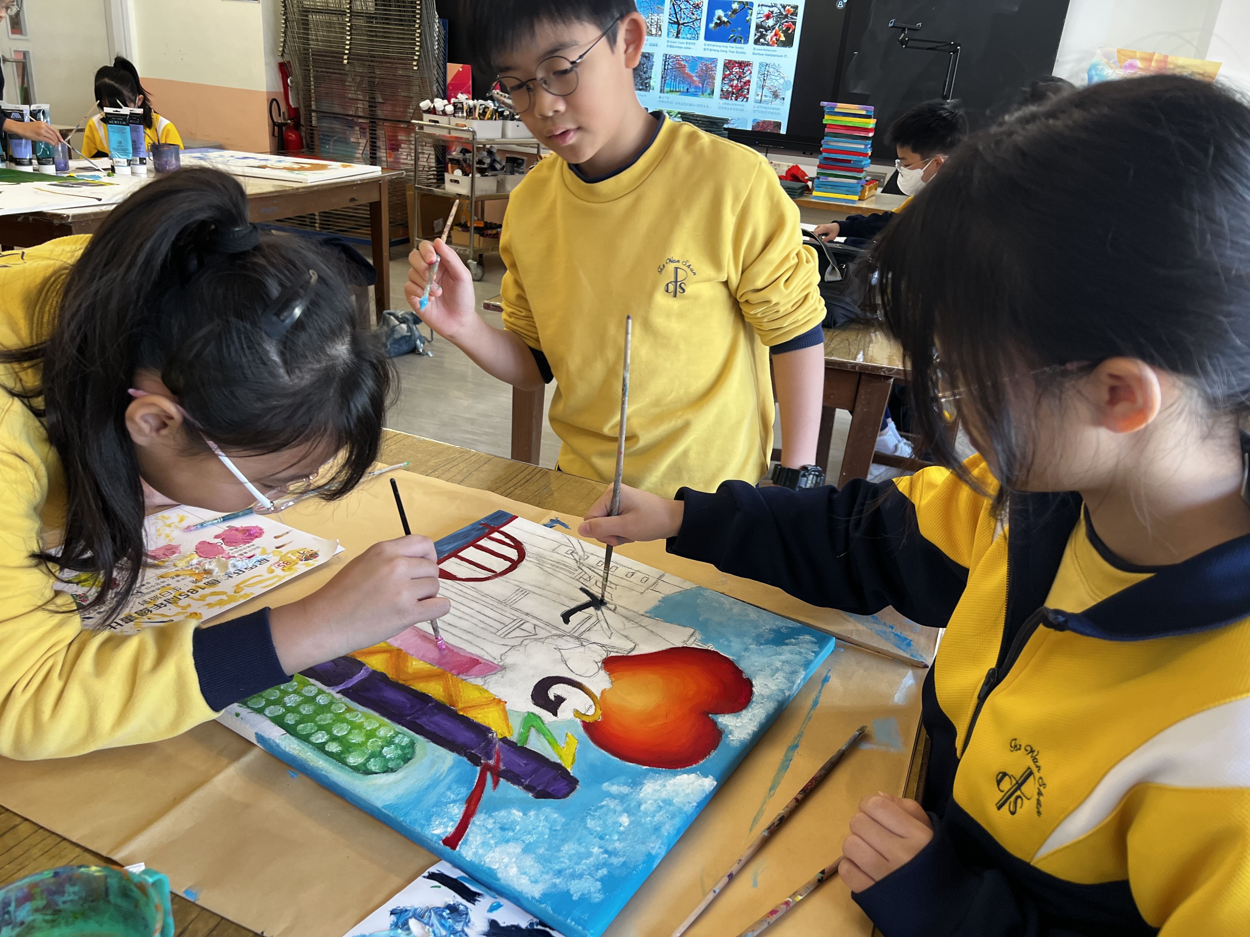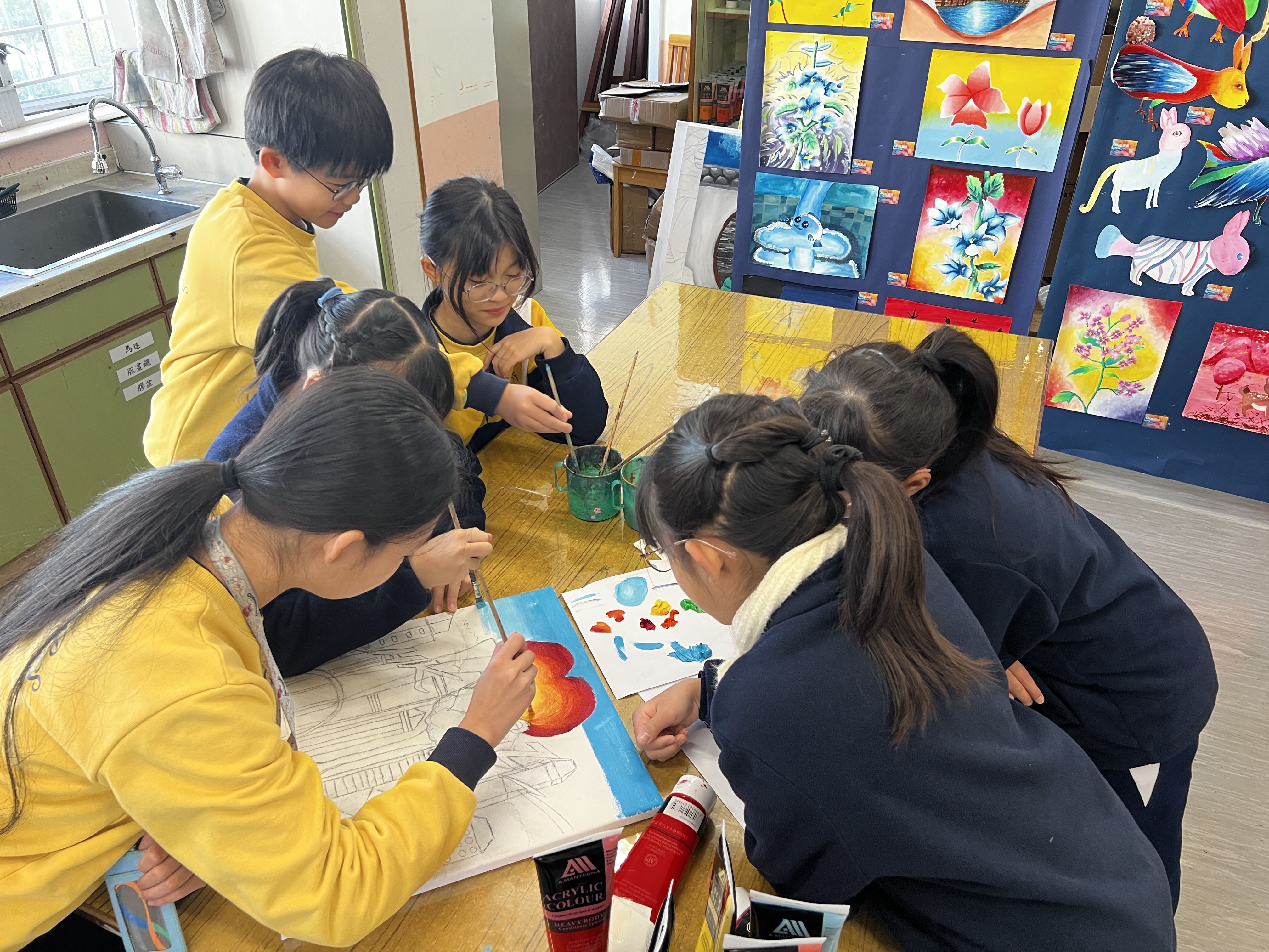 部分五至六年級同學將前往廣州市從化區河濱小學,展開姊妹學校作交流活動。視藝優才(高級組)的同學以「廣州與香港」為主題,創作了一幅塑膠彩繪畫作品,描繪兩地的城市風貌與情誼。這幅作品將作為交流禮物,贈送予河濱小學,象徵兩校聯繫的友誼與彼此學習的精神。