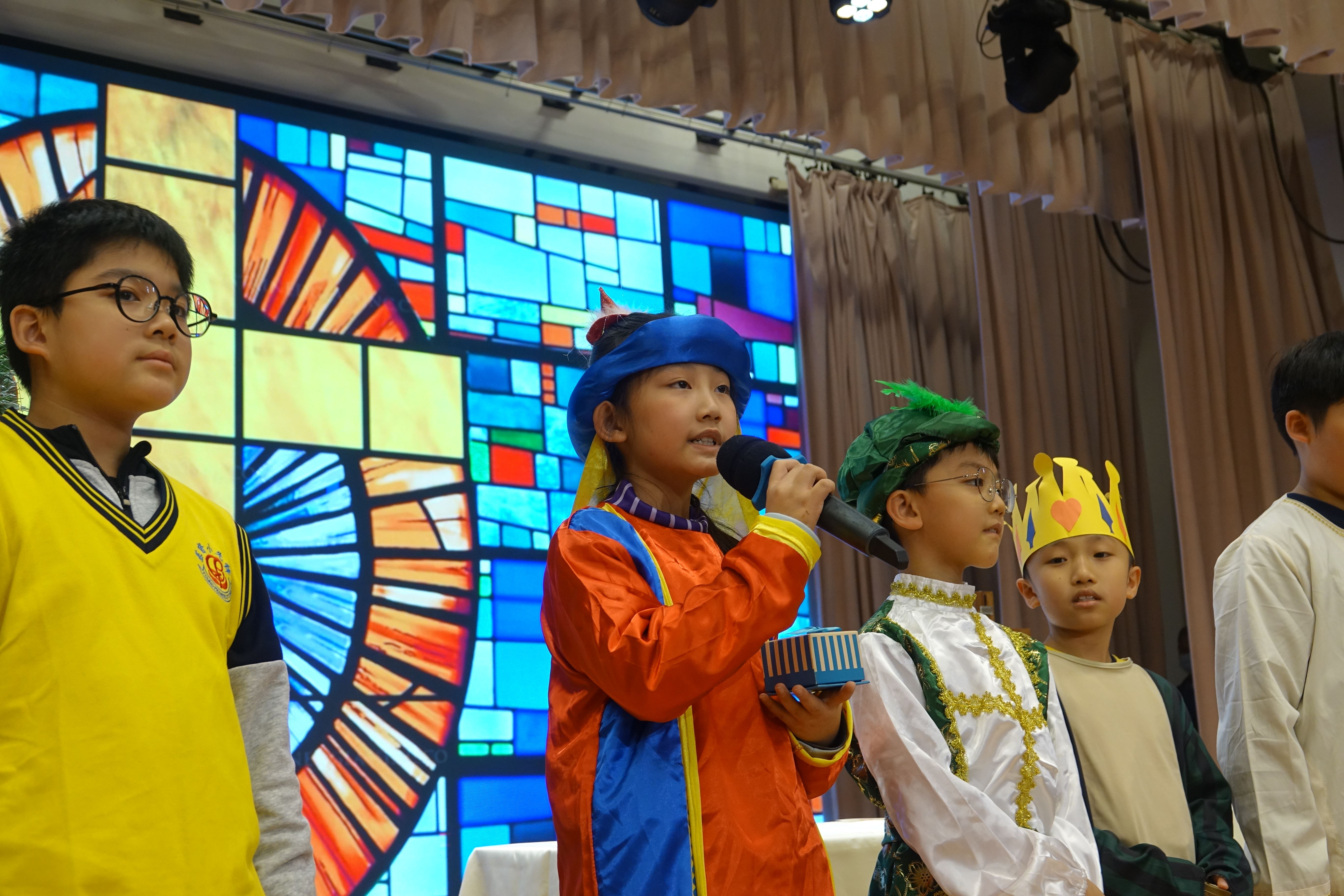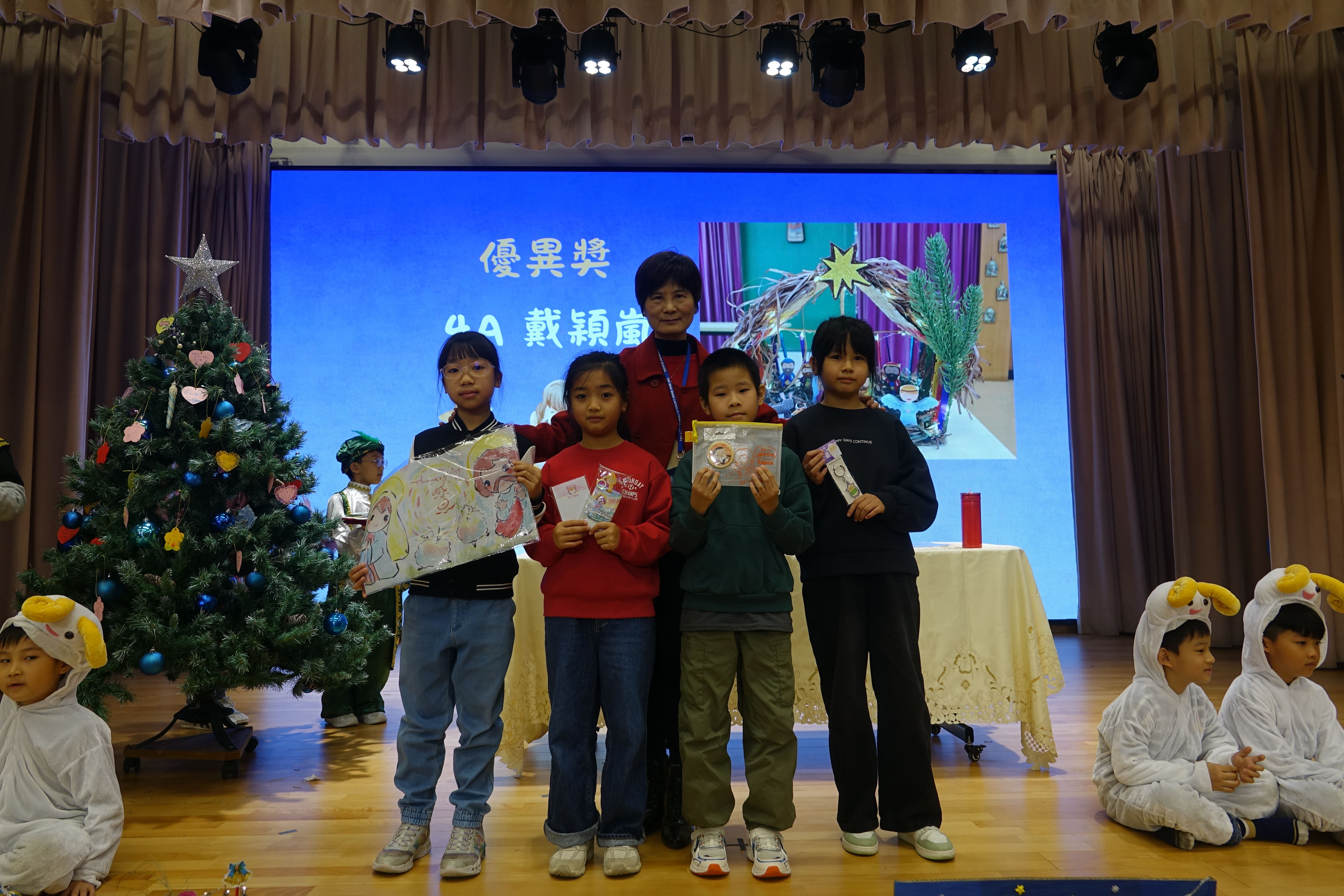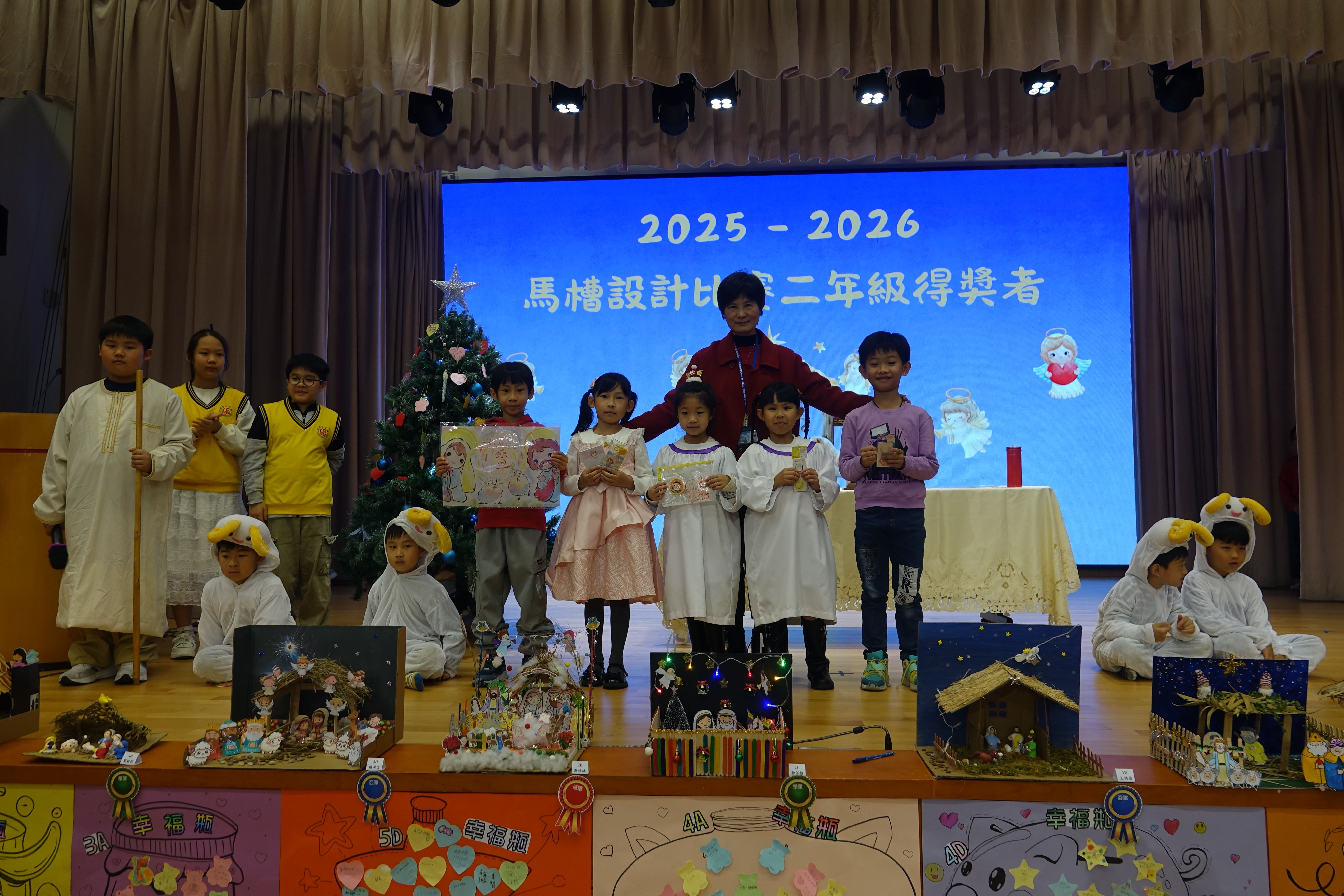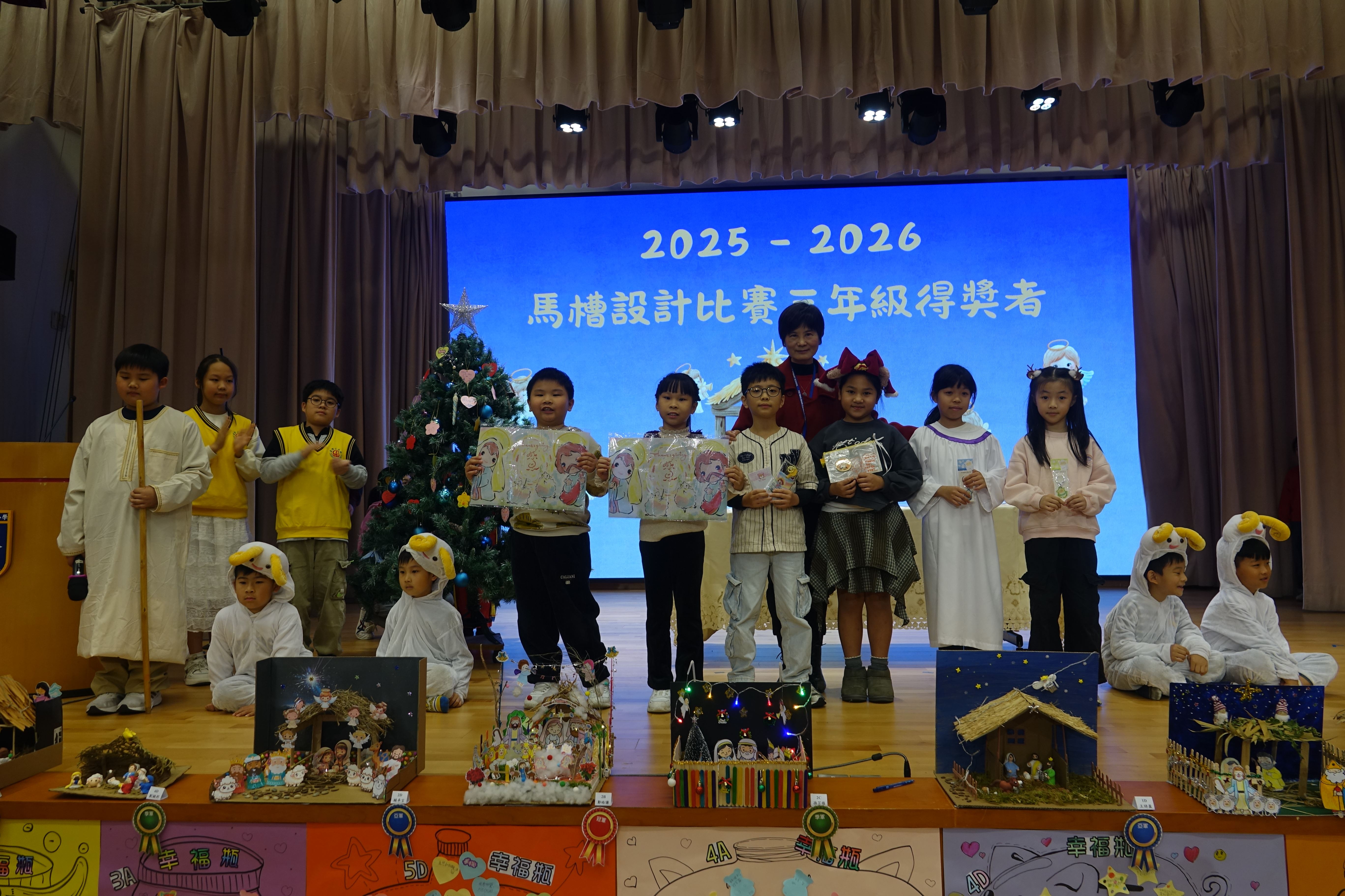 本年度聖誕祈禱會,老師藉著聖人聖尼各老的故事,帶出聖誕節的真諦在於與人分享,為人帶來希望。同學們透過製作幸福瓶,學會了珍惜自己所有,知足常樂,並由各班代表把心意卡及感恩卡掛在聖誕樹上,把幸福傳遞予社會上不同的人。禮儀中,學生代表更把明愛賣物會遊戲券及明愛慈善獎券籌得的善款,以及班際馬槽設計比賽獲獎作品,奉獻給耶穌作生日禮物。最後,由手鈴隊獻上兩首歌曲”Silent Night,Holy Night”及Peace”為祈禱會作結。