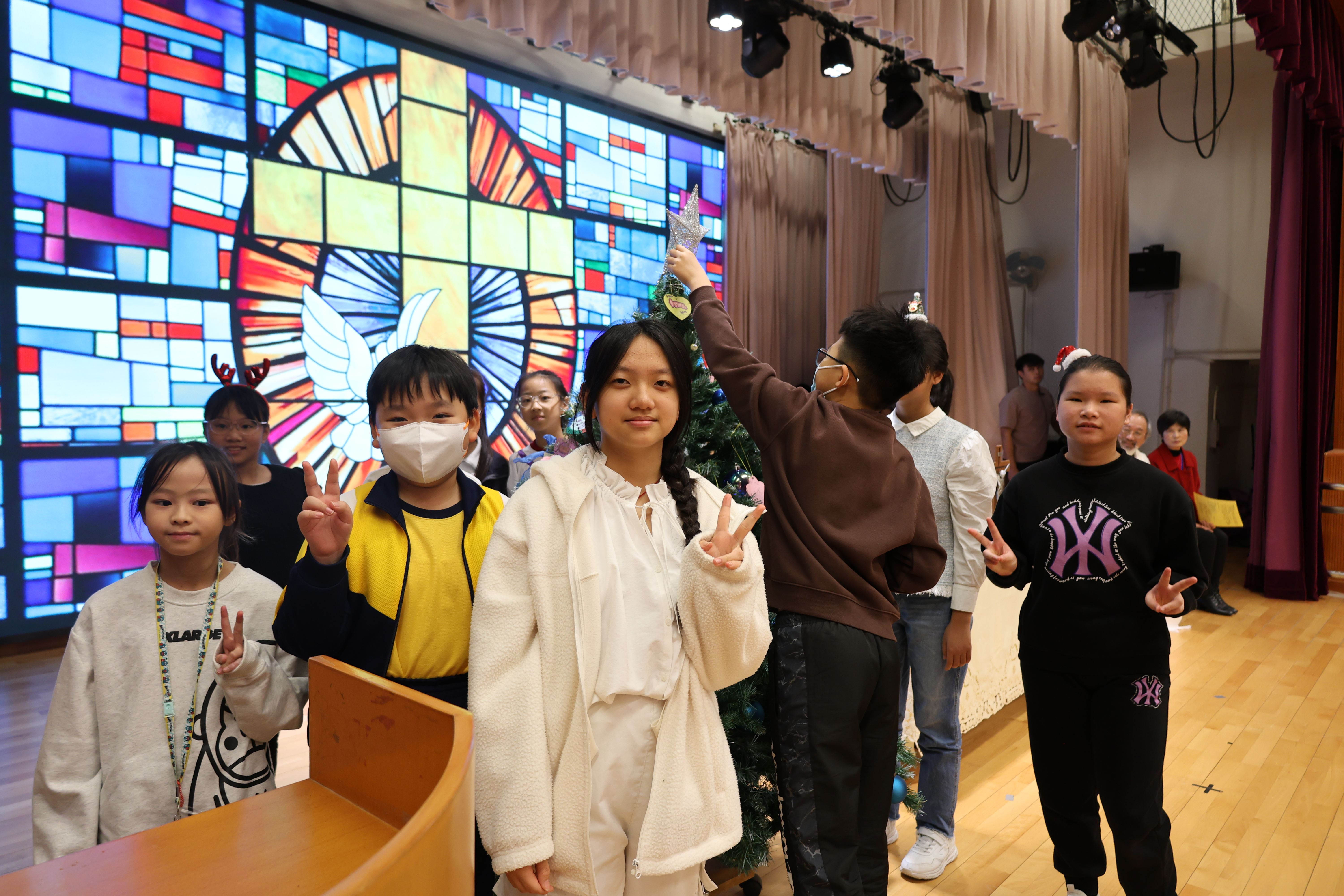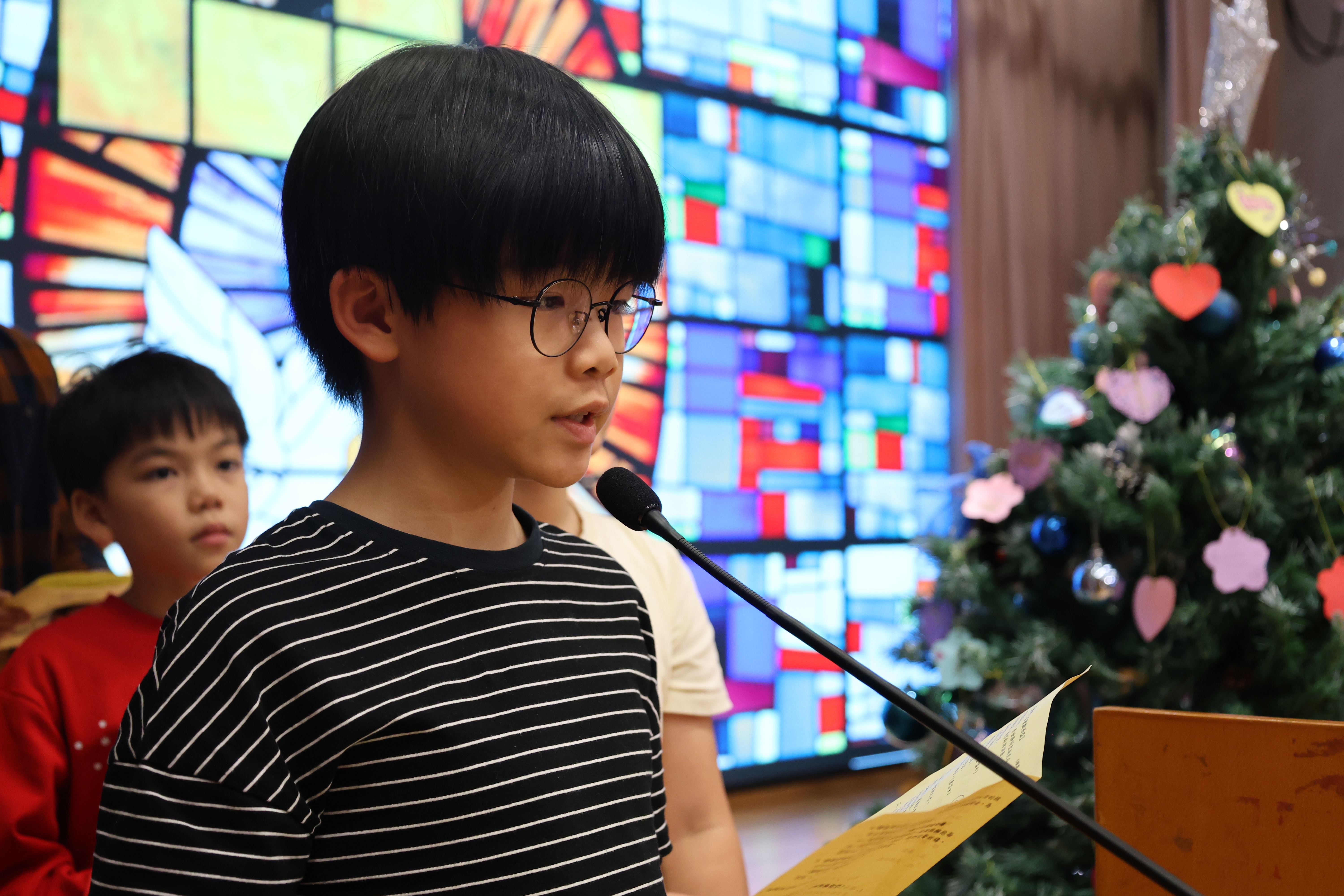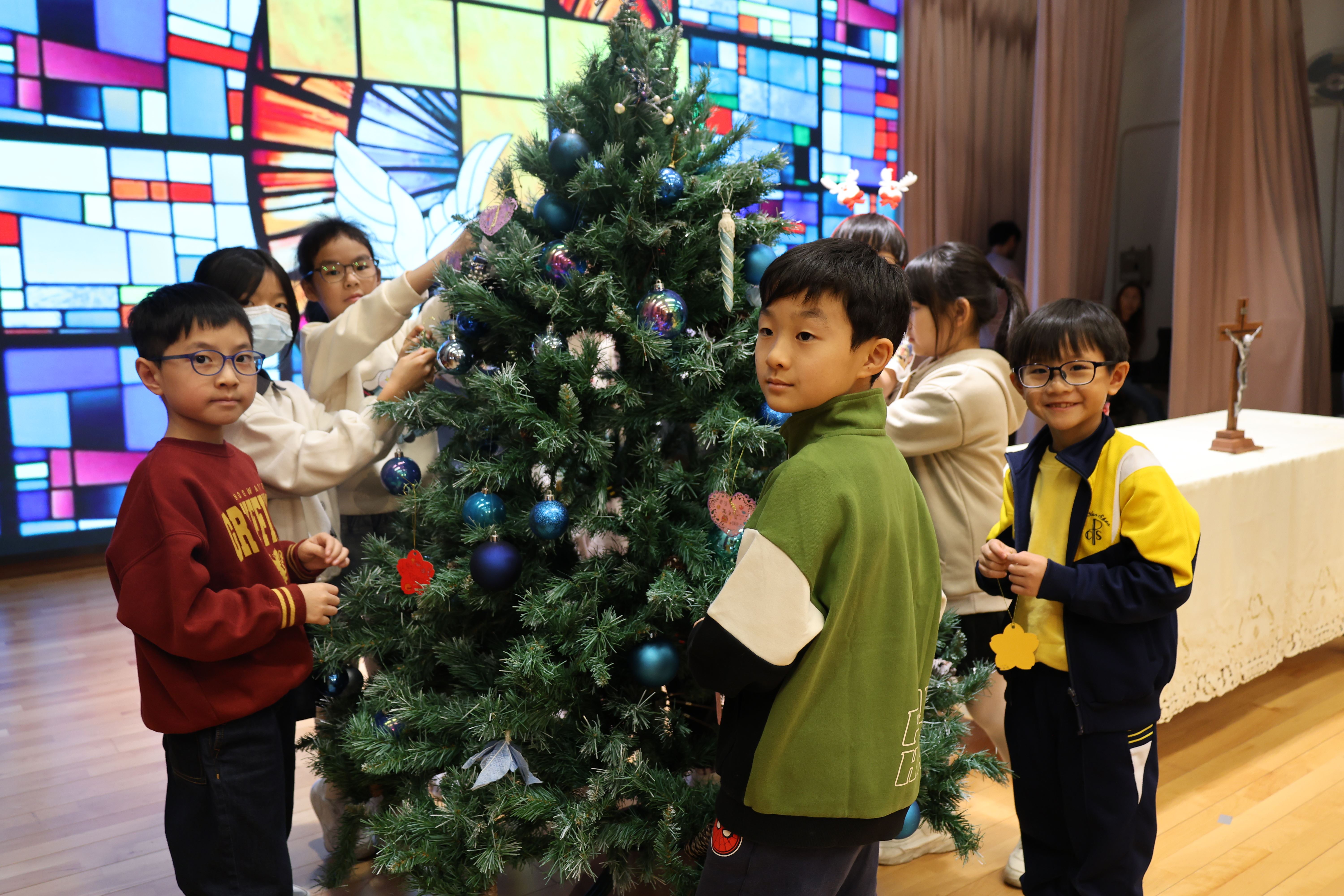 本年度聖誕祈禱會,老師藉著聖人聖尼各老的故事,帶出聖誕節的真諦在於與人分享,為人帶來希望。同學們透過製作幸福瓶,學會了珍惜自己所有,知足常樂,並由各班代表把心意卡及感恩卡掛在聖誕樹上,把幸福傳遞予社會上不同的人。禮儀中,學生代表更把明愛賣物會遊戲券及明愛慈善獎券籌得的善款,以及班際馬槽設計比賽獲獎作品,奉獻給耶穌作生日禮物。最後,由手鈴隊獻上兩首歌曲”Silent Night,Holy Night”及Peace”為祈禱會作結。