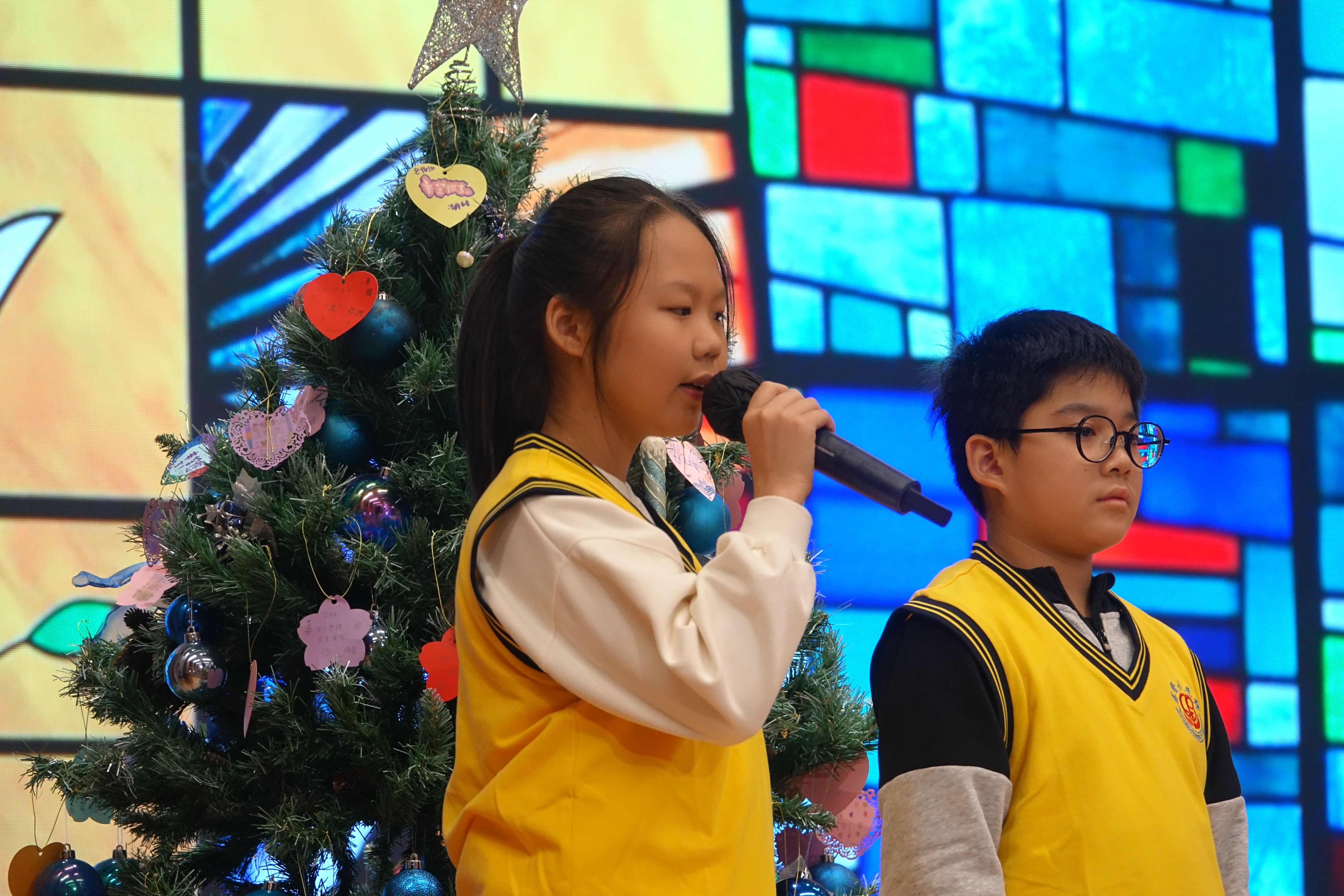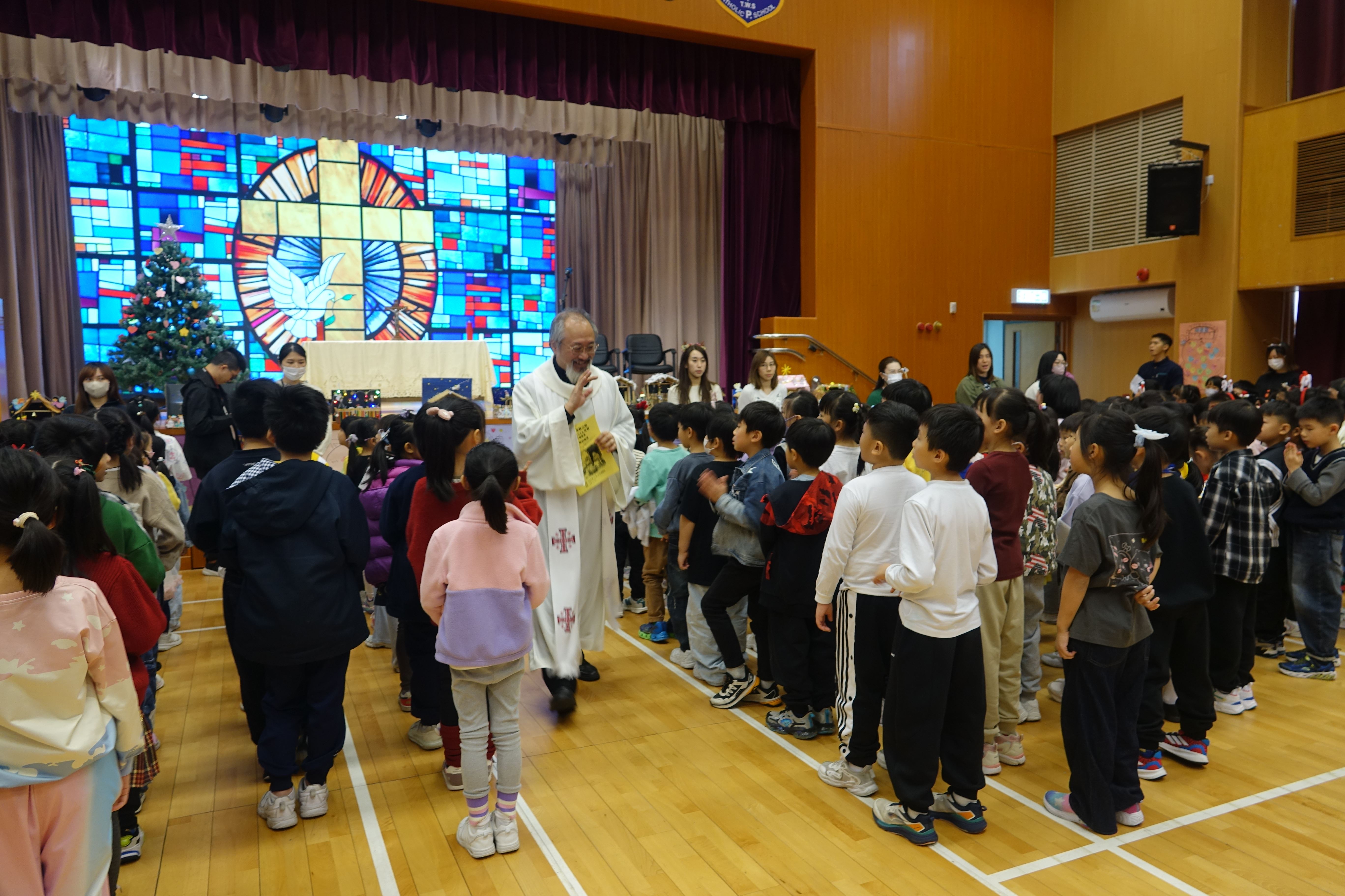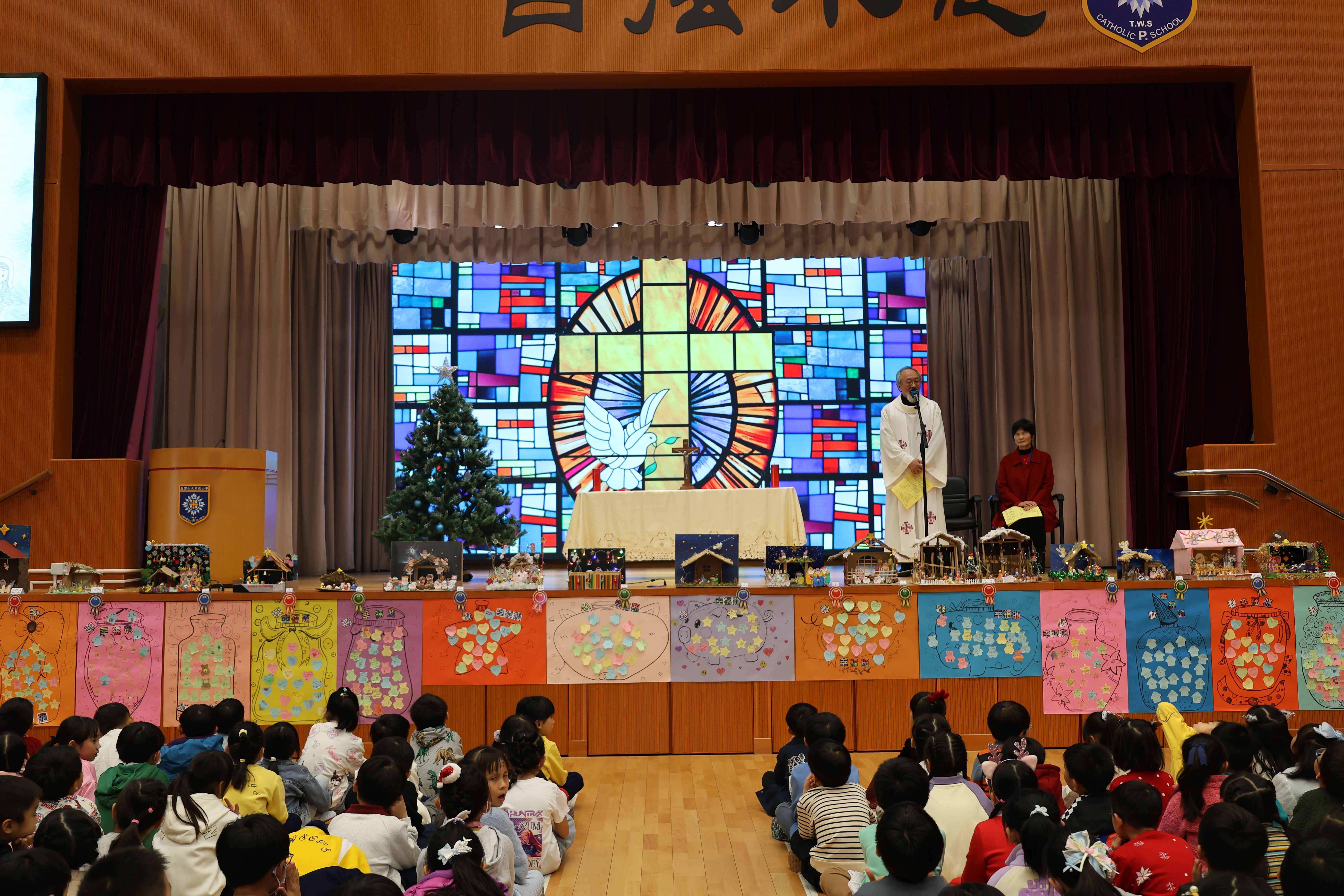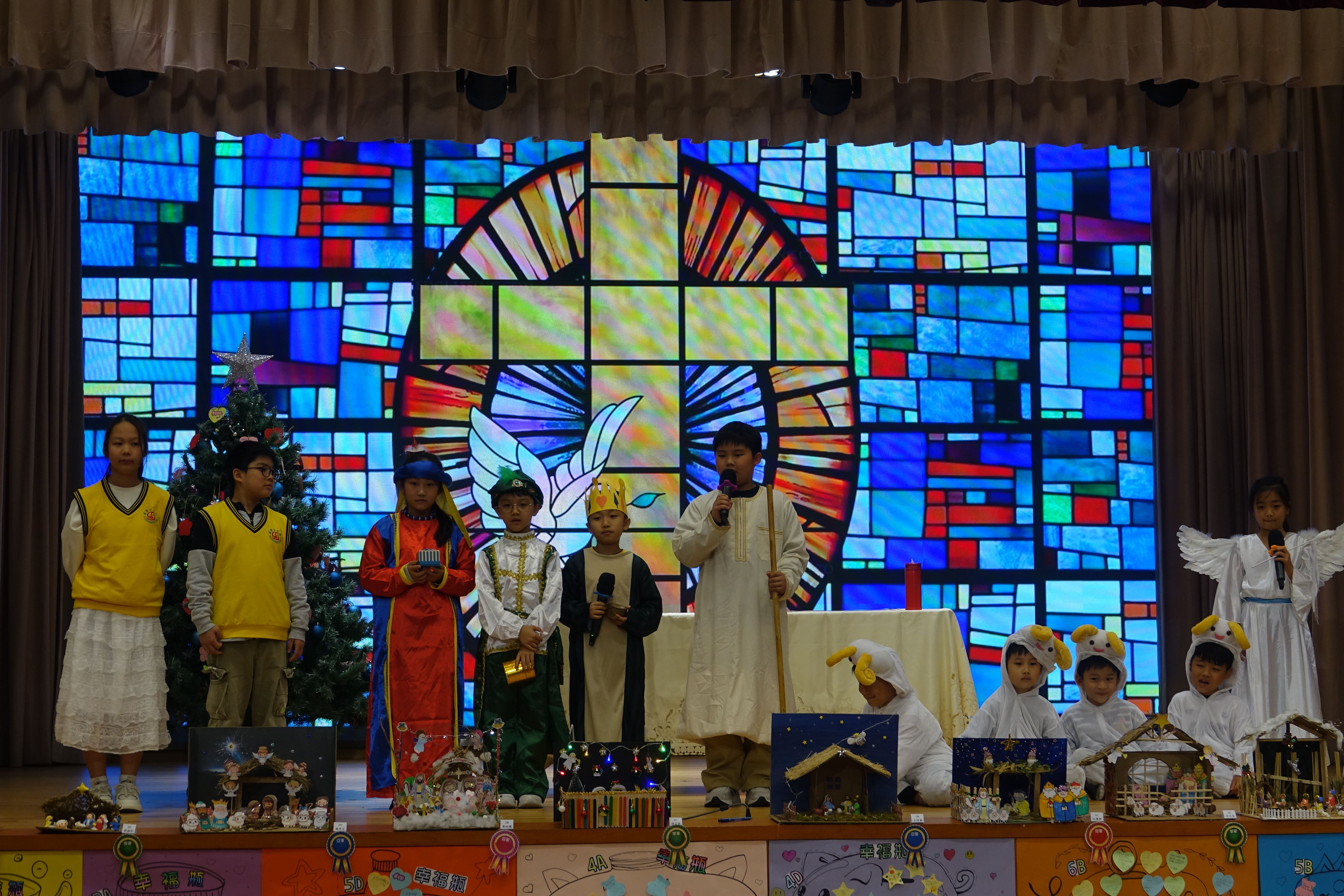 本年度聖誕祈禱會,老師藉著聖人聖尼各老的故事,帶出聖誕節的真諦在於與人分享,為人帶來希望。同學們透過製作幸福瓶,學會了珍惜自己所有,知足常樂,並由各班代表把心意卡及感恩卡掛在聖誕樹上,把幸福傳遞予社會上不同的人。禮儀中,學生代表更把明愛賣物會遊戲券及明愛慈善獎券籌得的善款,以及班際馬槽設計比賽獲獎作品,奉獻給耶穌作生日禮物。最後,由手鈴隊獻上兩首歌曲”Silent Night,Holy Night”及Peace”為祈禱會作結。