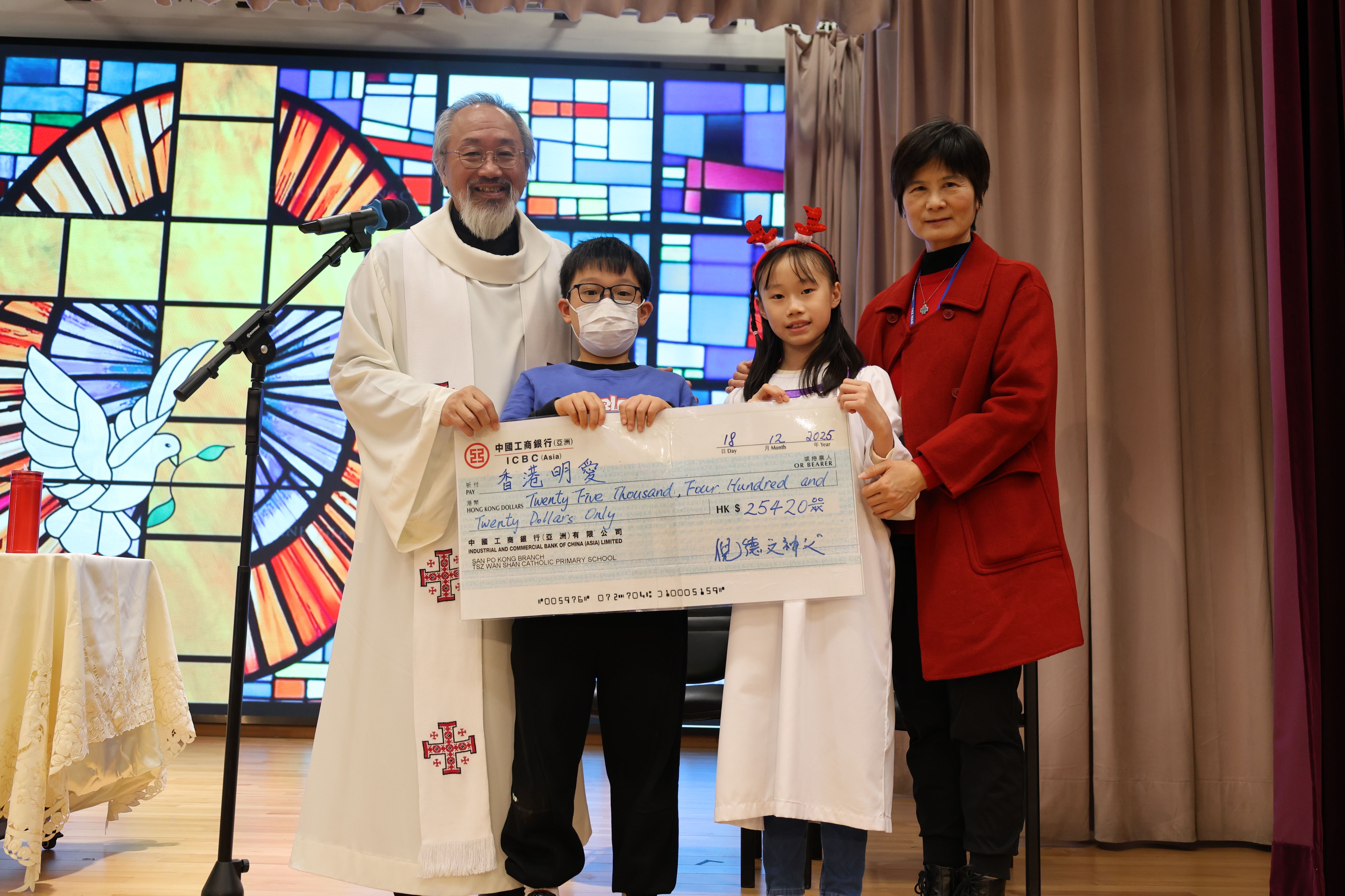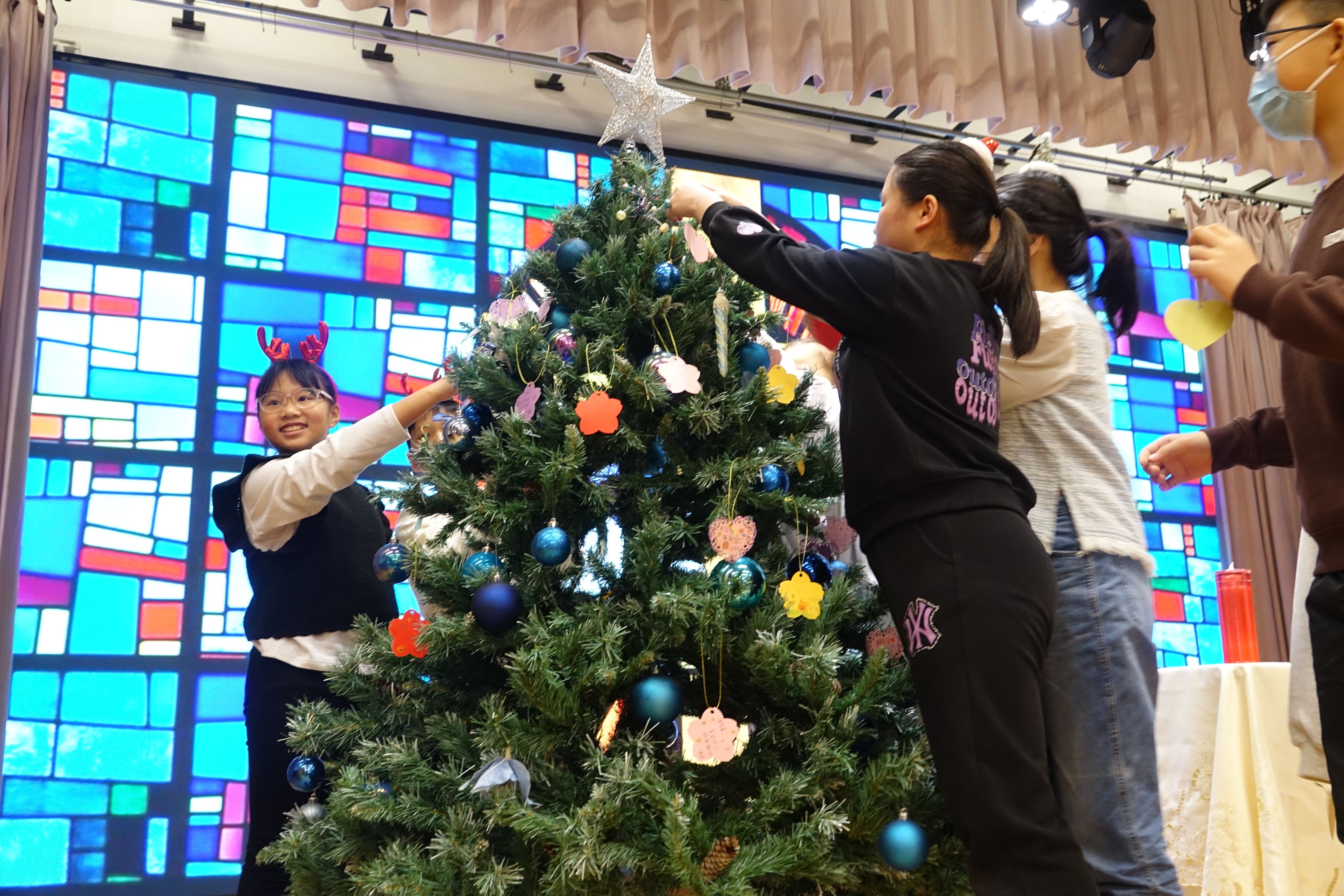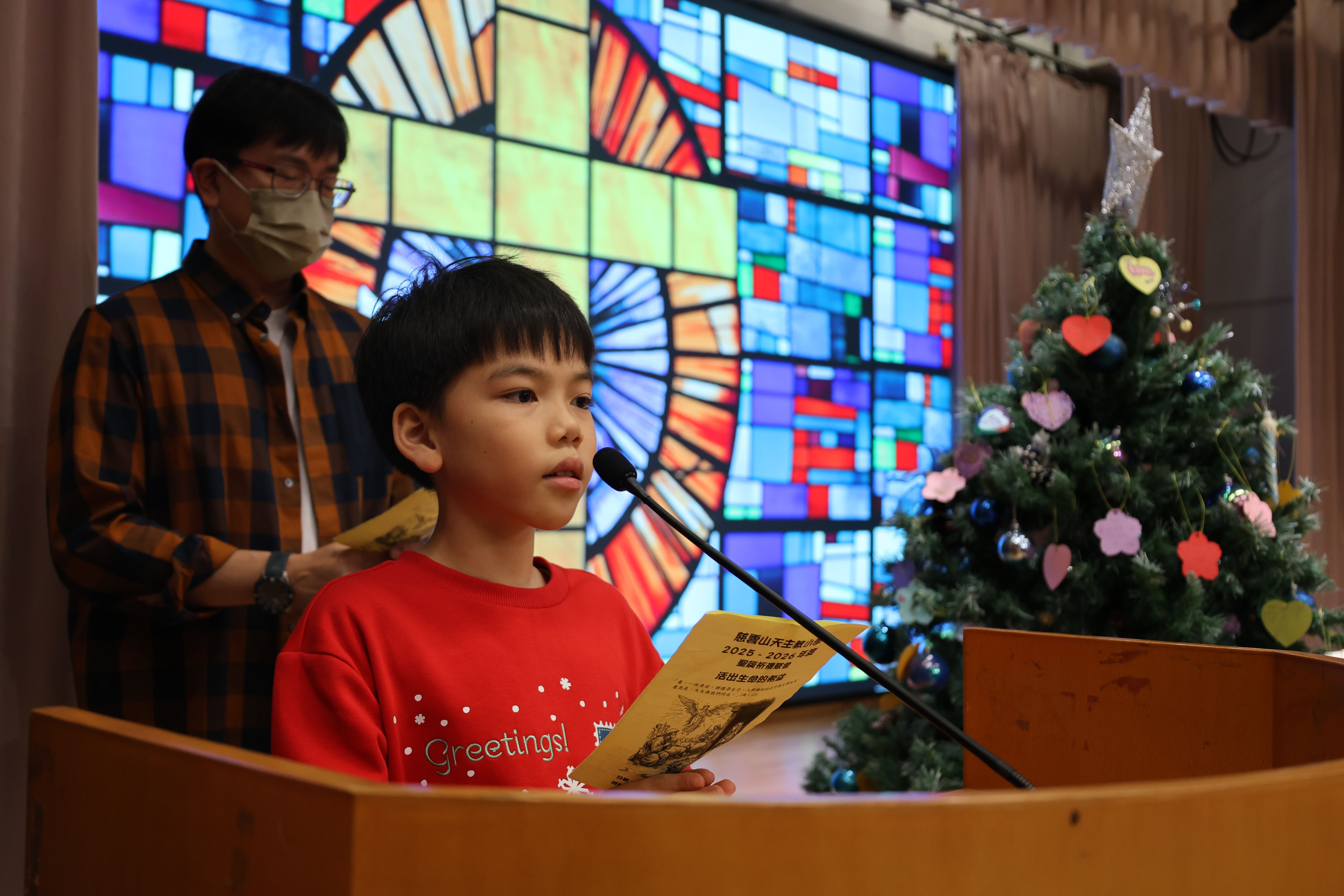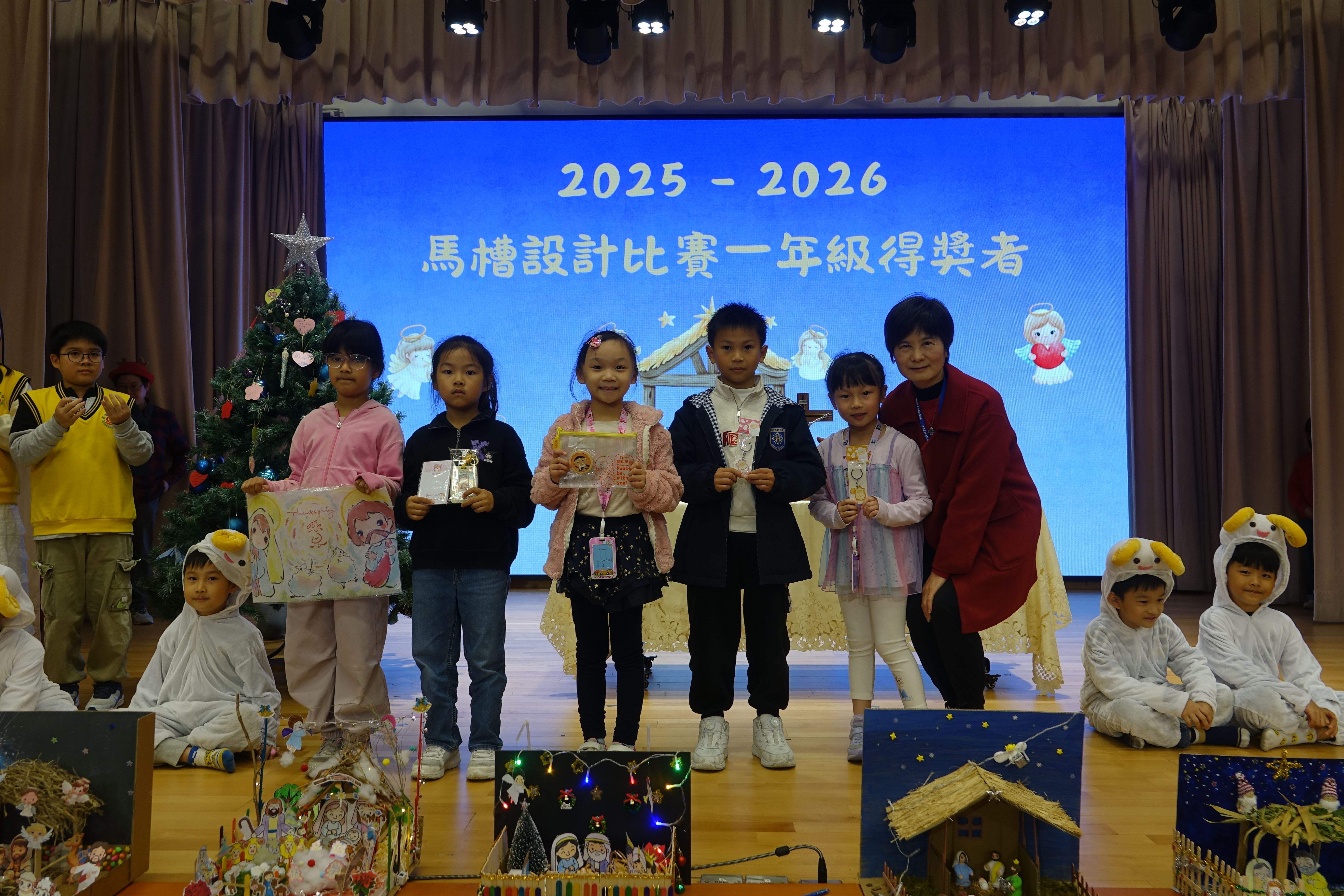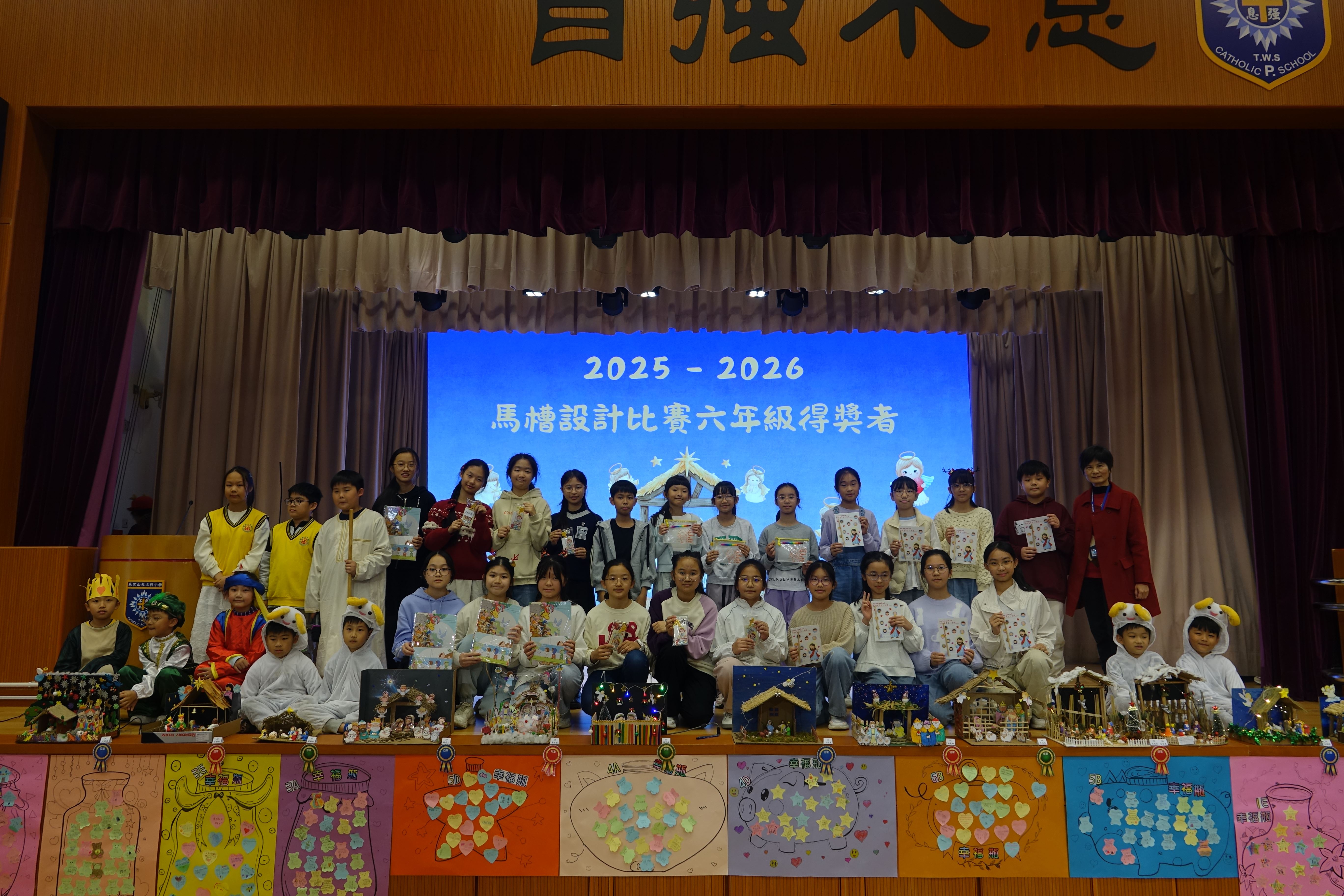 本年度聖誕祈禱會,老師藉著聖人聖尼各老的故事,帶出聖誕節的真諦在於與人分享,為人帶來希望。同學們透過製作幸福瓶,學會了珍惜自己所有,知足常樂,並由各班代表把心意卡及感恩卡掛在聖誕樹上,把幸福傳遞予社會上不同的人。禮儀中,學生代表更把明愛賣物會遊戲券及明愛慈善獎券籌得的善款,以及班際馬槽設計比賽獲獎作品,奉獻給耶穌作生日禮物。最後,由手鈴隊獻上兩首歌曲”Silent Night,Holy Night”及Peace”為祈禱會作結。