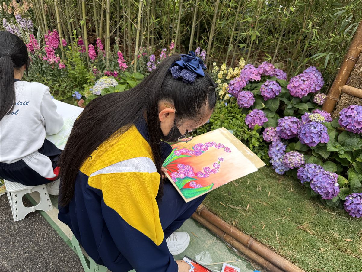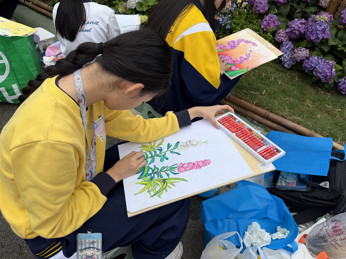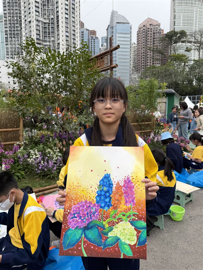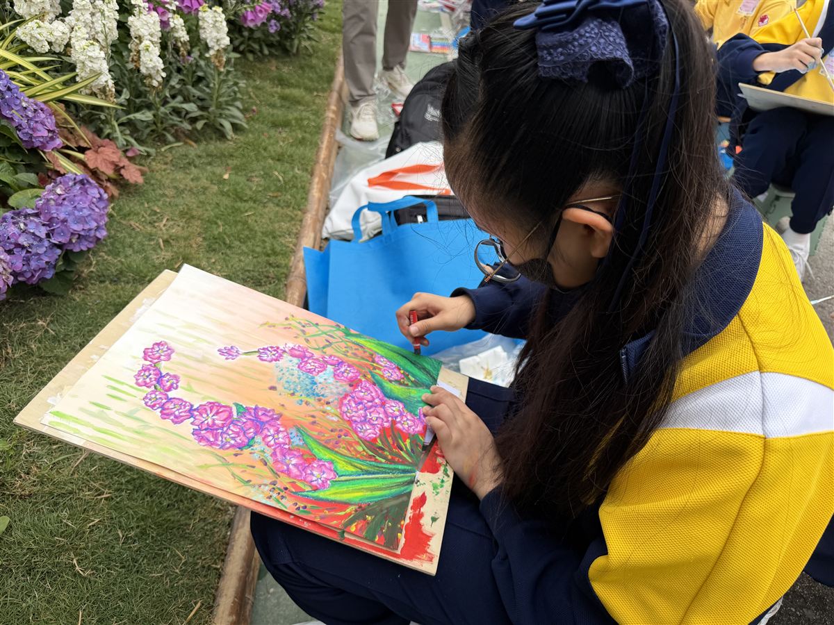 本校視覺藝術優材同學早前前往維多利亞公園,參加「2026年賽馬會花卉展覽學童繪畫比賽」。當日陽光明媚,學生們在繁花似錦、姿態萬千的紫羅蘭花叢前,用心觀察並在三小時內描繪花卉的姿彩,展現出高超的藝術表現力。 恭喜6E林凱婷同學在全港約二千名小學生中脫穎而出,進入全港二十三名內,勇奪(高小組)嘉許獎,成績斐然!